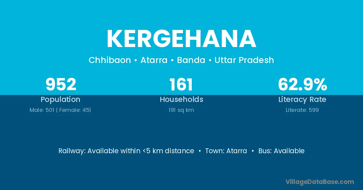 Kergehana village has a total population of 952 people, of which 501 are males and 451 are females.