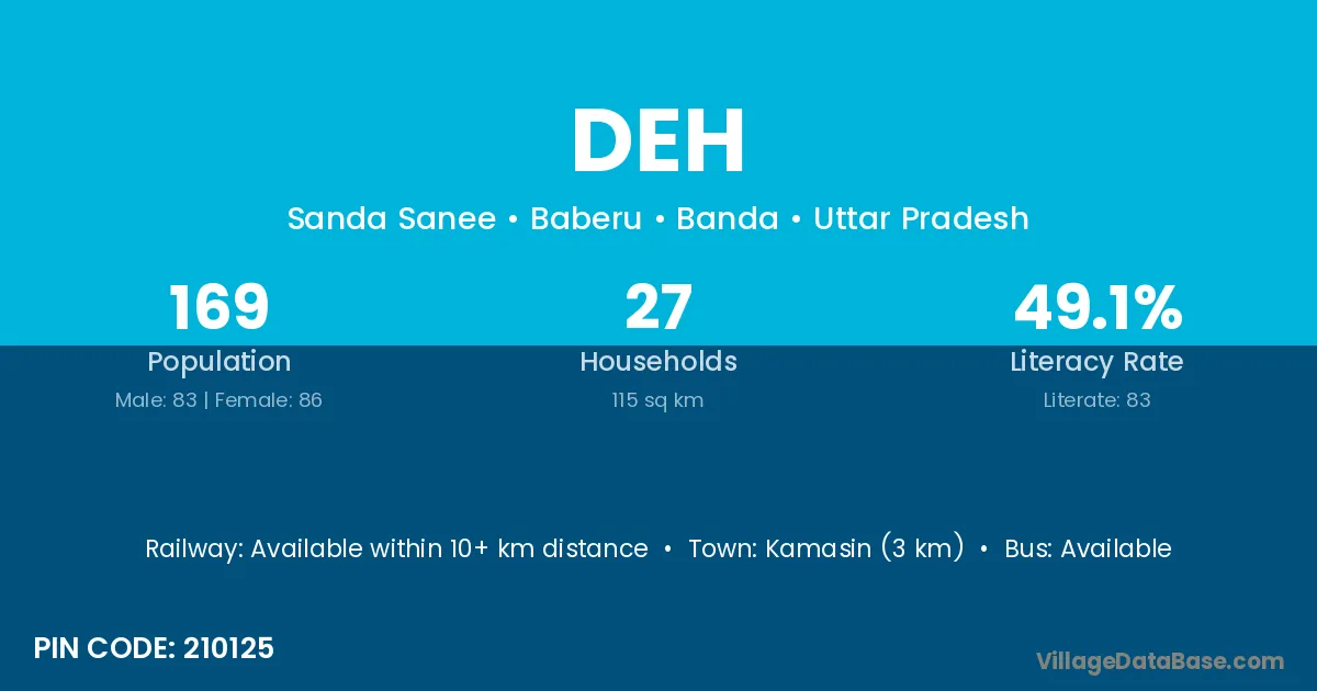 Deh village has a total population of 169 people, of which 83 are males and 86 are females.