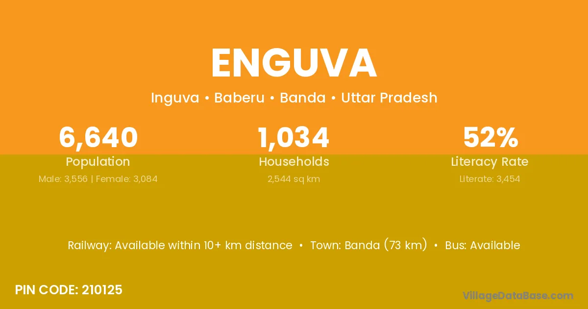Banda (73 km) is the nearest town to Enguva village for major economic activities and is located approximately 73 km away.