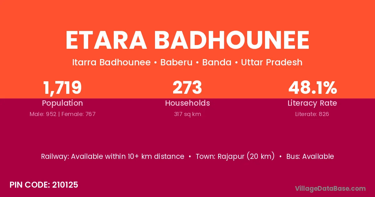 Rajapur (20 km) is the nearest town to Etara Badhounee village for major economic activities and is located approximately 20 km away.