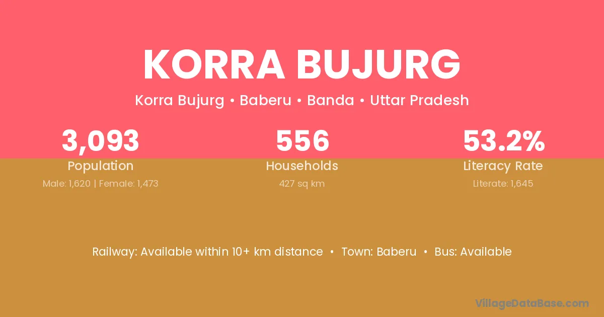 Korra Bujurg village has a total population of 3,093 people, of which 1,620 are males and 1,473 are females.