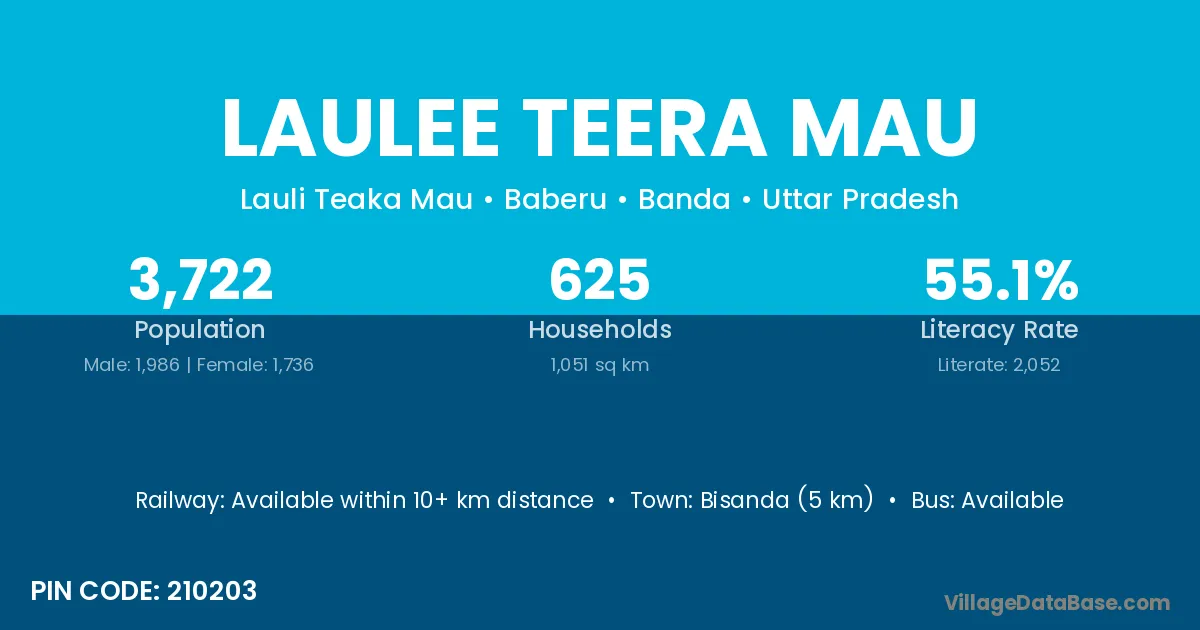 Laulee Teera Mau village has a total population of 3,722 people, of which 1,986 are males and 1,736 are females.