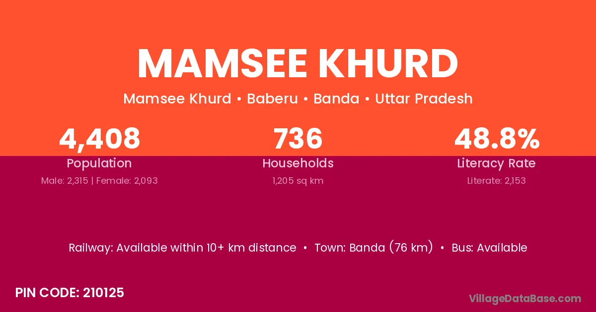 Banda (76 km) is the nearest town to Mamsee Khurd village for major economic activities and is located approximately 76 km away.