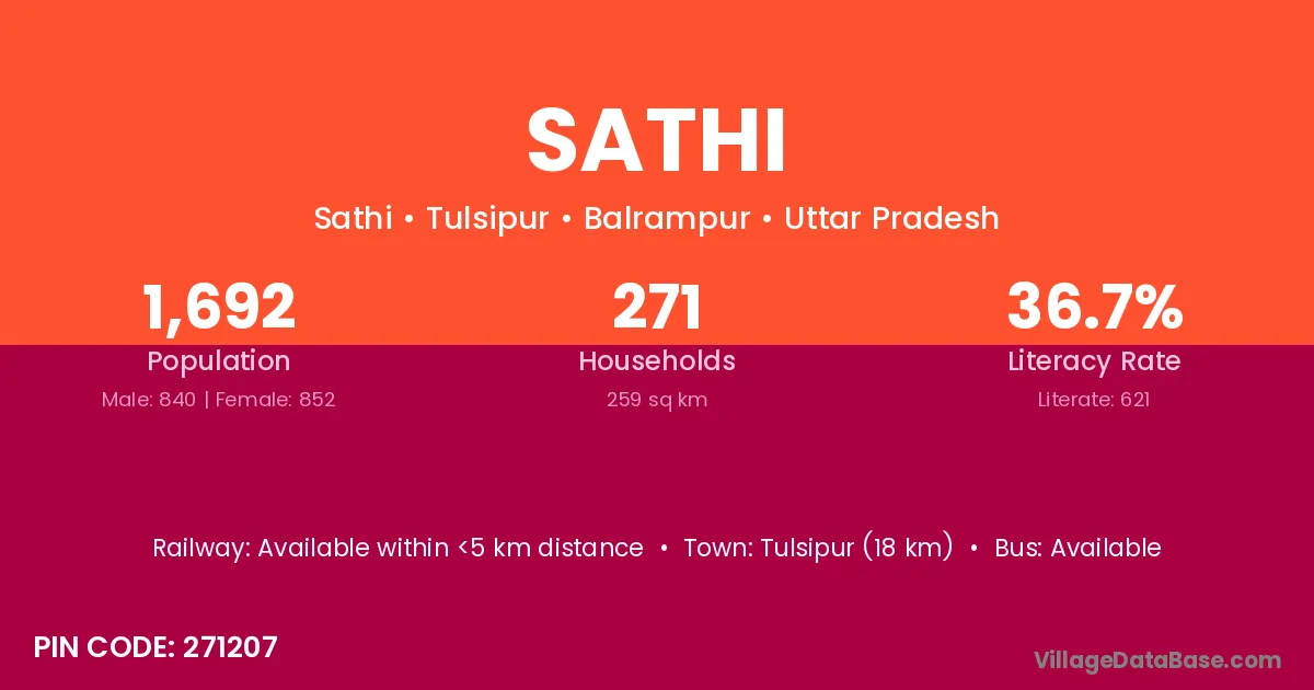 The literacy rate of Sathi village is 53.64%. Male literacy stands at 66.44% and female literacy at 38.46%.