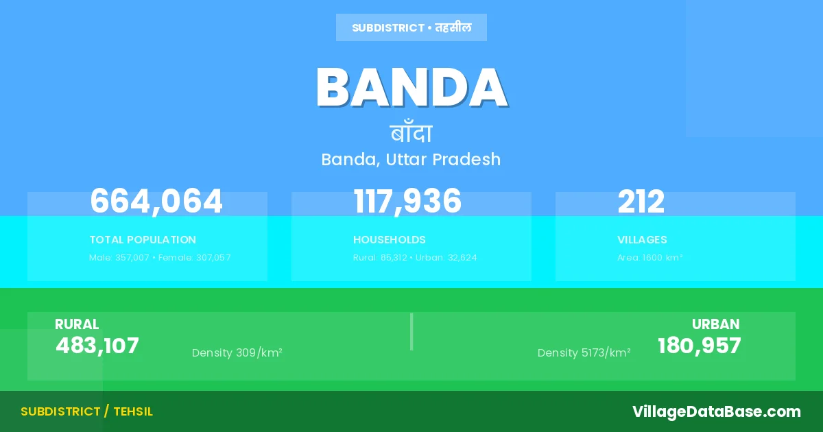 According to the 2011 census The total area of Banda Tehsil is 1600 km², with a population of 664064 people. The population density is 415 inhabitants per square kilometre, and there are approximately 117936 houses in the sub district.