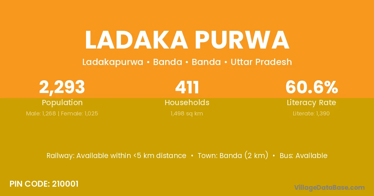 Banda (2 km) is the nearest town to Ladaka Purwa village for major economic activities and is located approximately 2 km away.