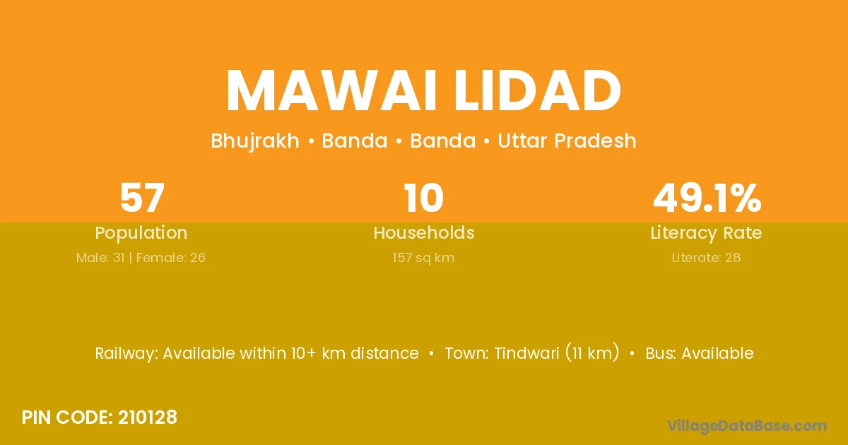 Tindwari (11 km) is the nearest town to Mawai Lidad village for major economic activities and is located approximately 11 km away.