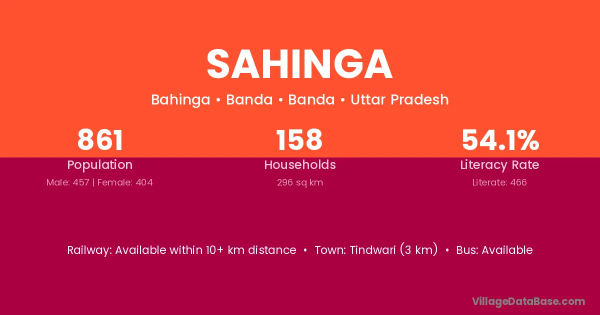 Sahinga village has a total population of 861 people, of which 457 are males and 404 are females.