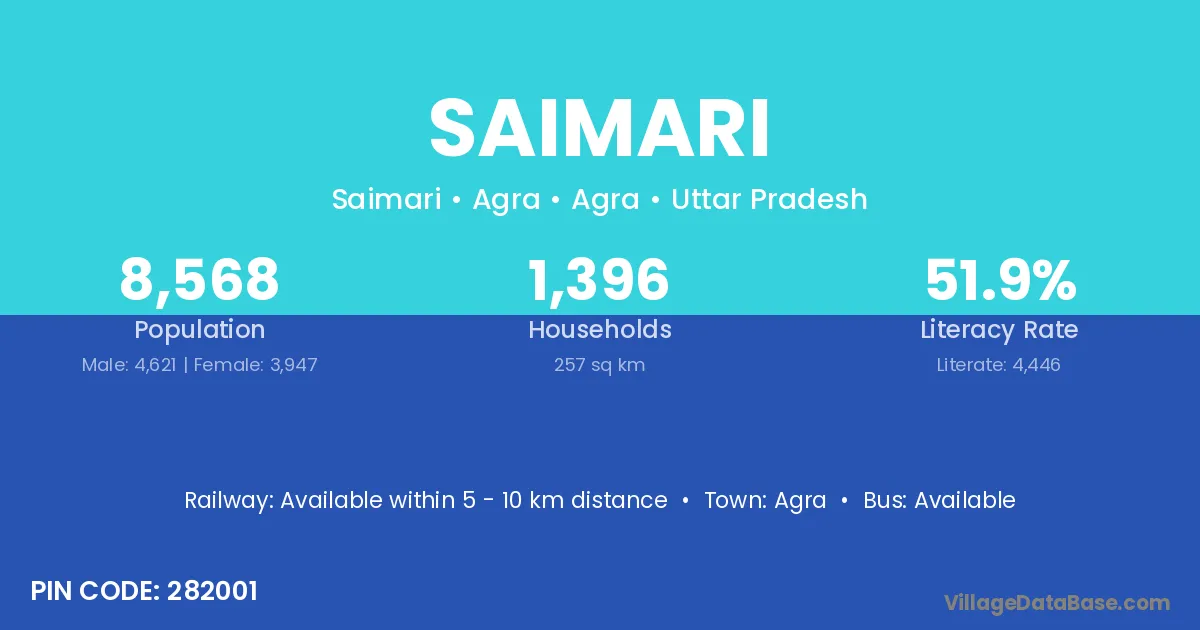Saimari village has a total population of 3,183 people, of which 1,801 are males and 1,382 are females.
