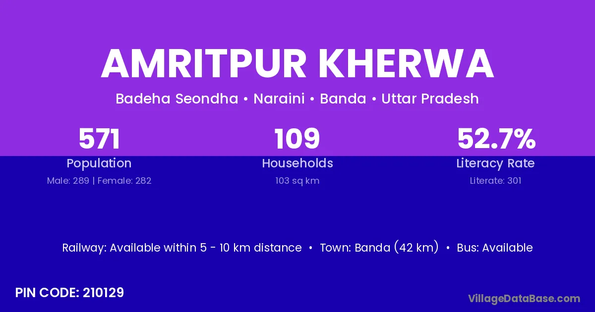 Banda (42 km) is the nearest town to Amritpur Kherwa village for major economic activities and is located approximately 42 km away.