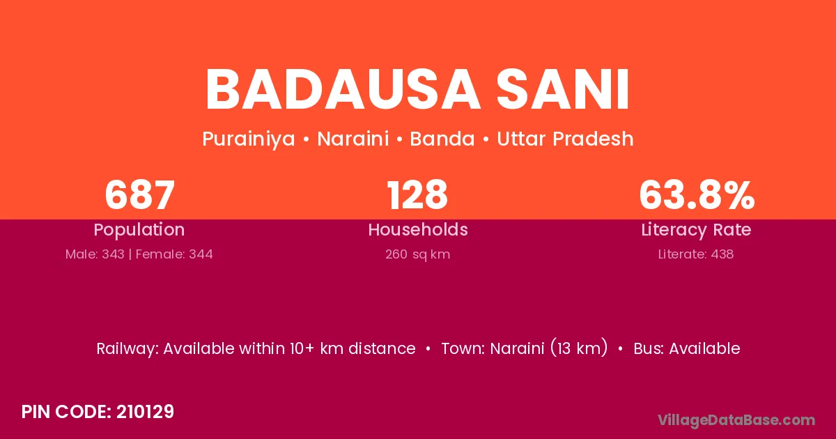 Naraini (13 km) is the nearest town to Badausa Sani village for major economic activities and is located approximately 13 km away.
