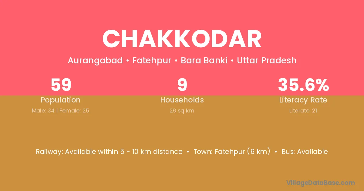 Chakkodar village has a total population of 59 people, of which 34 are males and 25 are females.