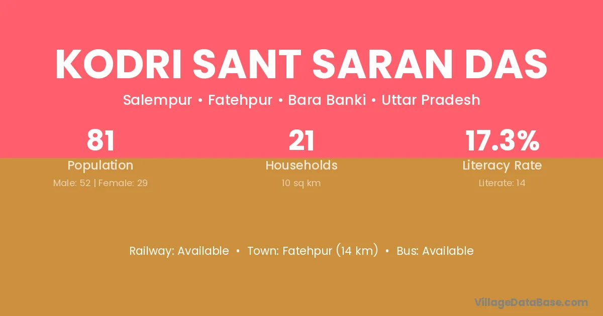Fatehpur (14 km) is the nearest town to Kodri Sant Saran Das village for major economic activities and is located approximately 14 km away.