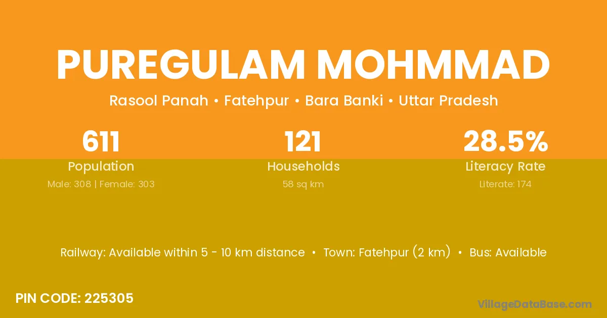 Fatehpur (2 km) is the nearest town to Puregulam Mohmmad village for major economic activities and is located approximately 2 km away.
