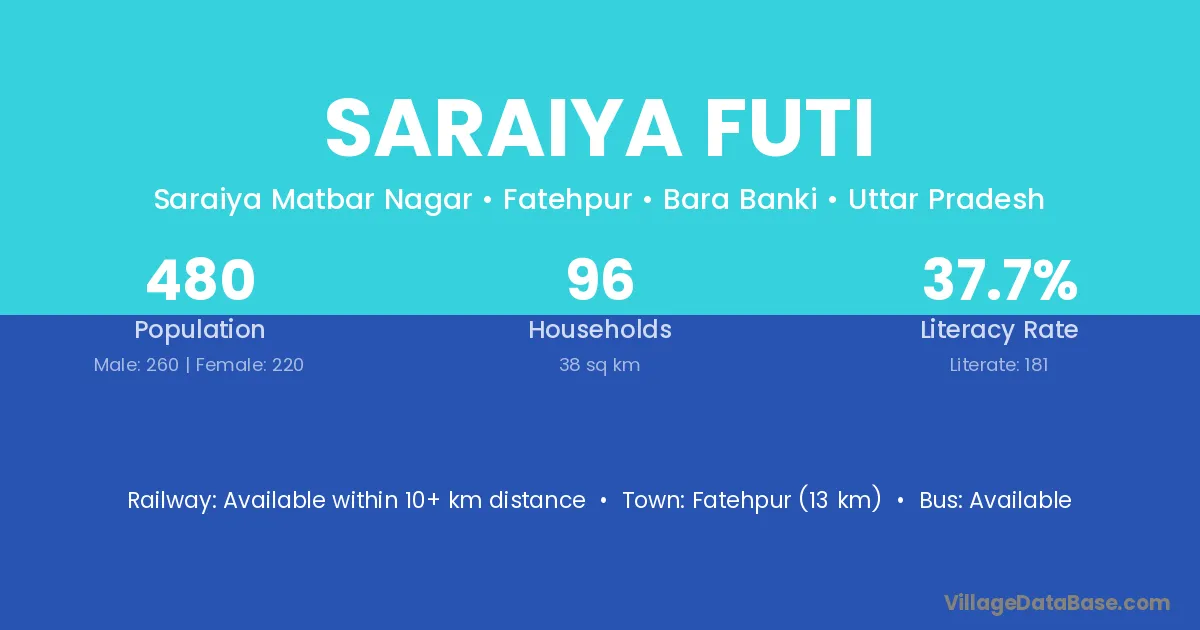 Fatehpur (13 km) is the nearest town to Saraiya Futi village for major economic activities and is located approximately 13 km away.