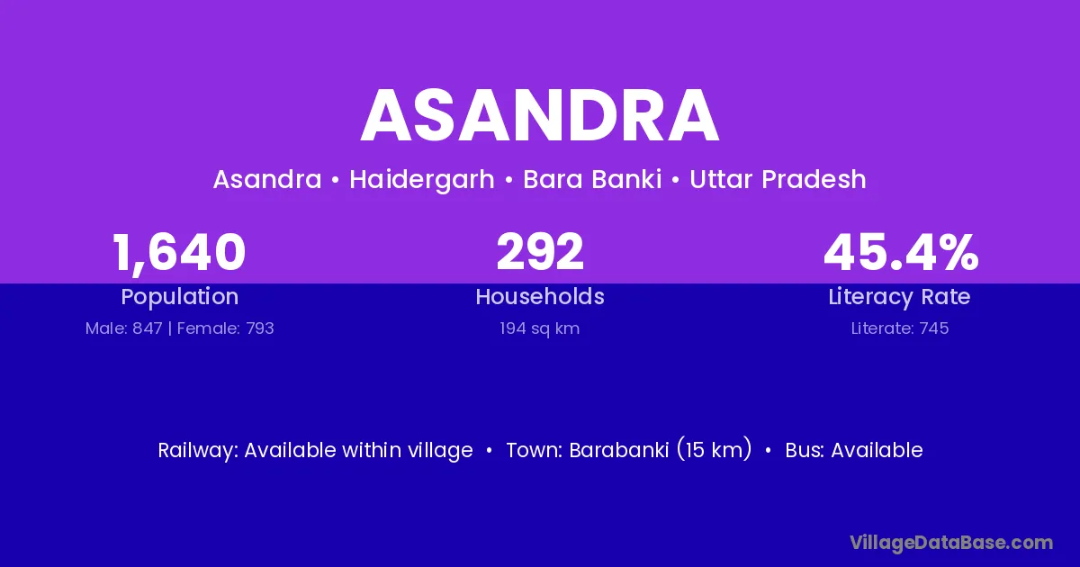 Barabanki (15 km) is the nearest town to Asandra village for major economic activities and is located approximately 15 km away.