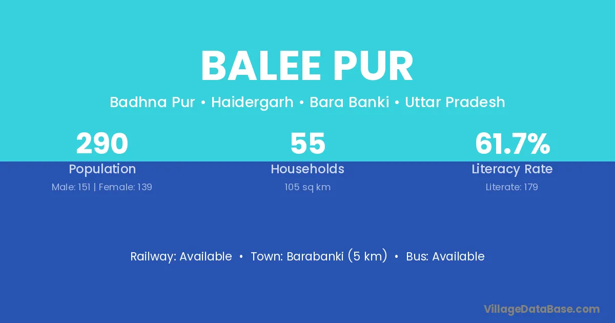Barabanki (5 km) is the nearest town to Balee Pur village for major economic activities and is located approximately 5 km away.