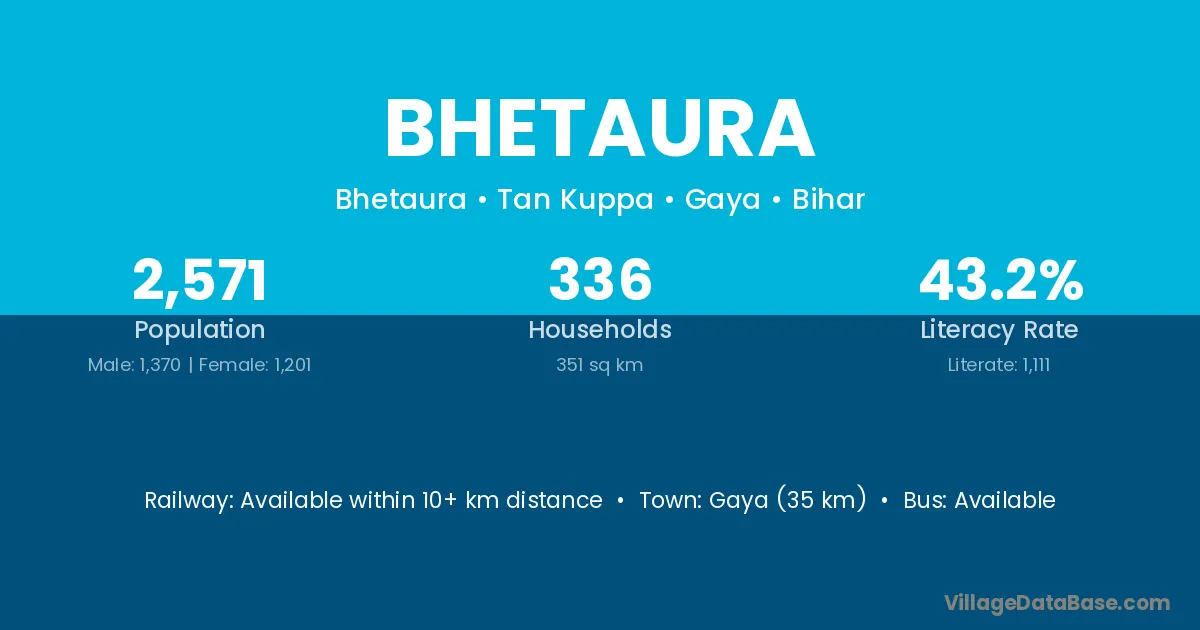 The literacy rate of Bhetaura village is 47.54%. Male literacy stands at 55.53% and female literacy at 39.65%.