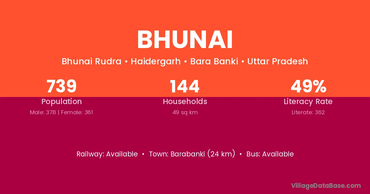 Bhunai village has a total population of 739 people, of which 378 are males and 361 are females.
