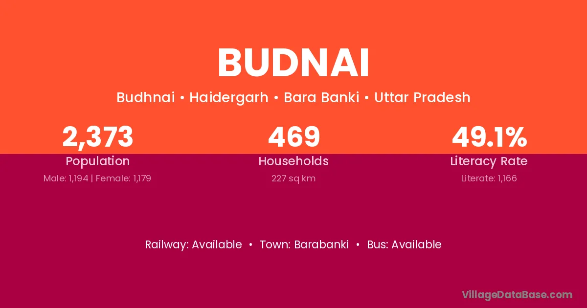 Budnai village has a total population of 2,373 people, of which 1,194 are males and 1,179 are females.