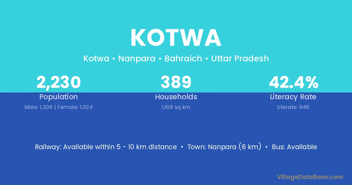 Barabanki (49 km) is the nearest town to Kotwa village for major economic activities and is located approximately 49 km away.