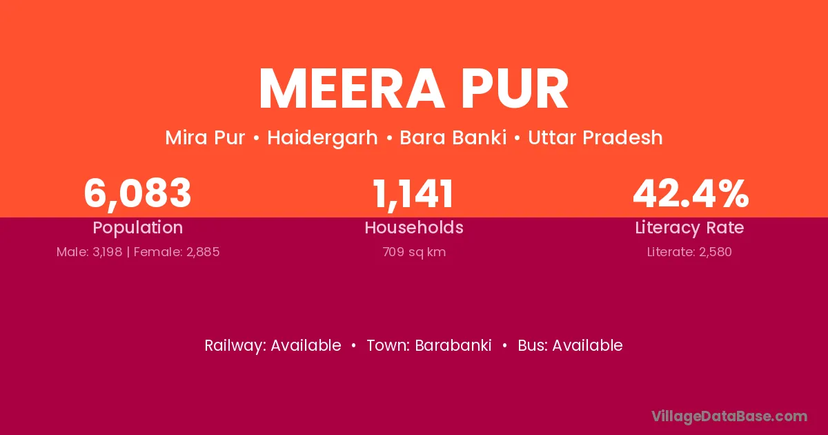 Meera Pur village has a total population of 6,083 people, of which 3,198 are males and 2,885 are females.