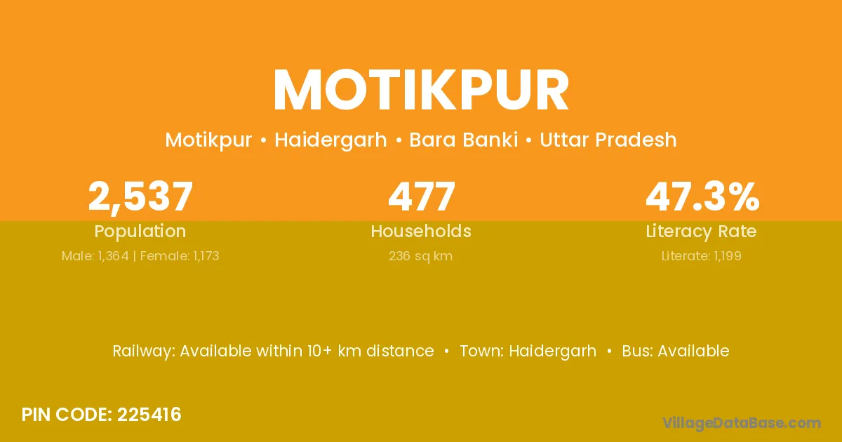 Motikpur village has a total population of 2,537 people, of which 1,364 are males and 1,173 are females.