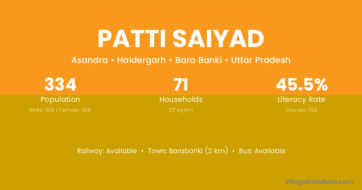 Barabanki (2 km) is the nearest town to Patti Saiyad village for major economic activities and is located approximately 2 km away.