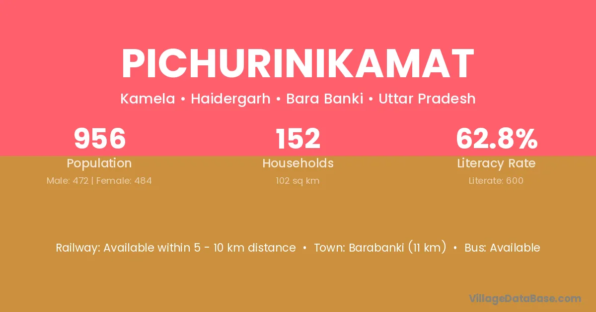 Barabanki (11 km) is the nearest town to Pichurinikamat village for major economic activities and is located approximately 11 km away.