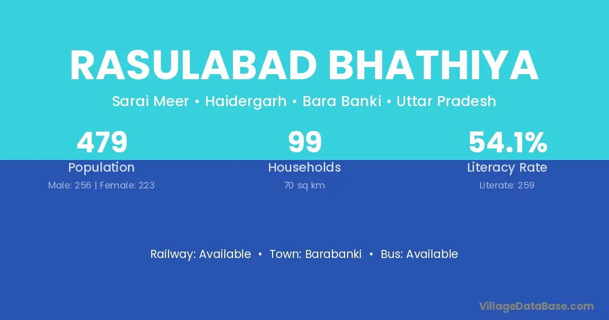 Rasulabad Bhathiya village has a total population of 479 people, of which 256 are males and 223 are females.