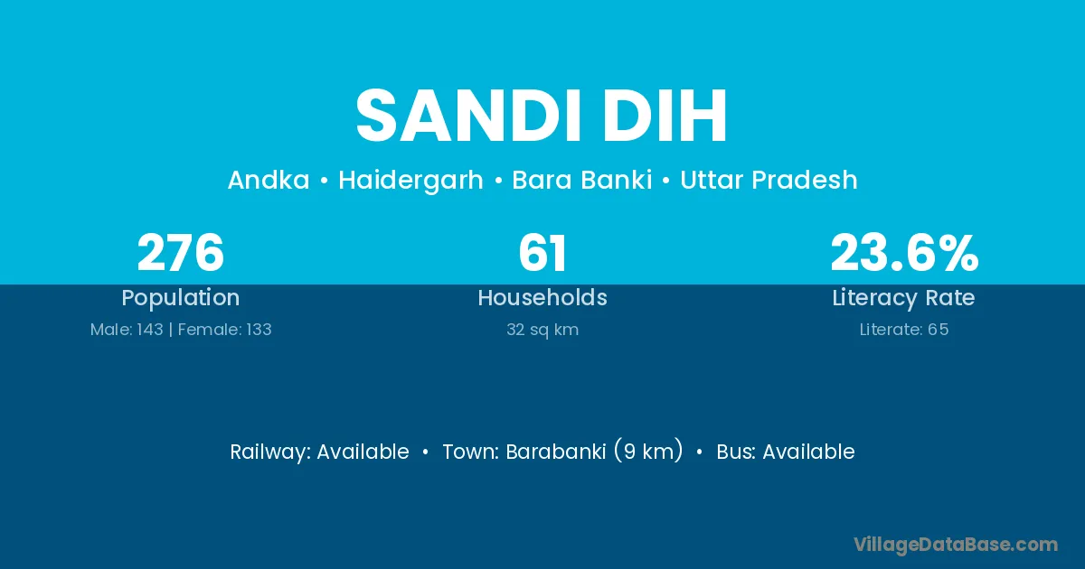Barabanki (9 km) is the nearest town to Sandi Dih village for major economic activities and is located approximately 9 km away.