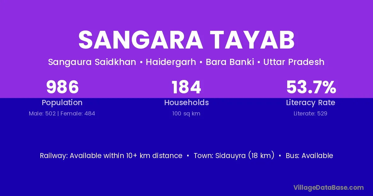 Sangara Tayab village has a total population of 986 people, of which 502 are males and 484 are females.