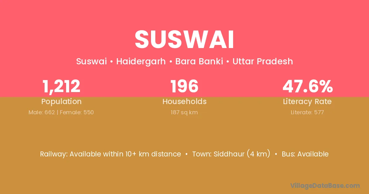 Suswai village has a total population of 1,212 people, of which 662 are males and 550 are females.