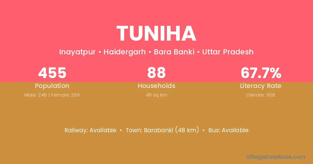 Barabanki (48 km) is the nearest town to Tuniha village for major economic activities and is located approximately 48 km away.