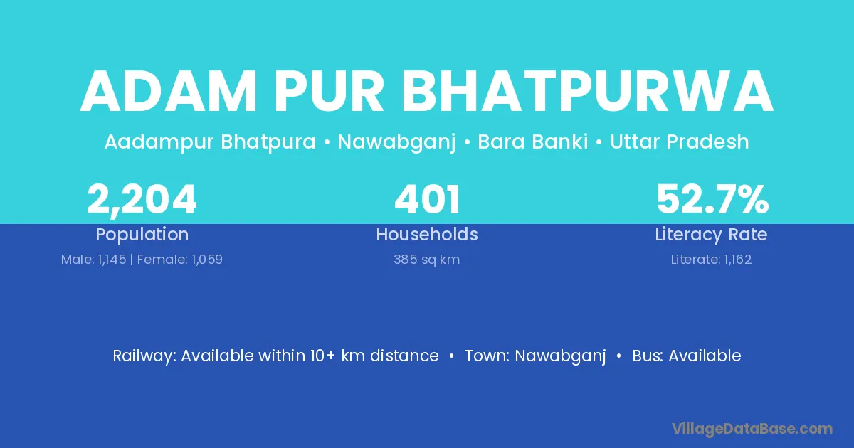 Adam Pur Bhatpurwa village has a total population of 2,204 people, of which 1,145 are males and 1,059 are females.