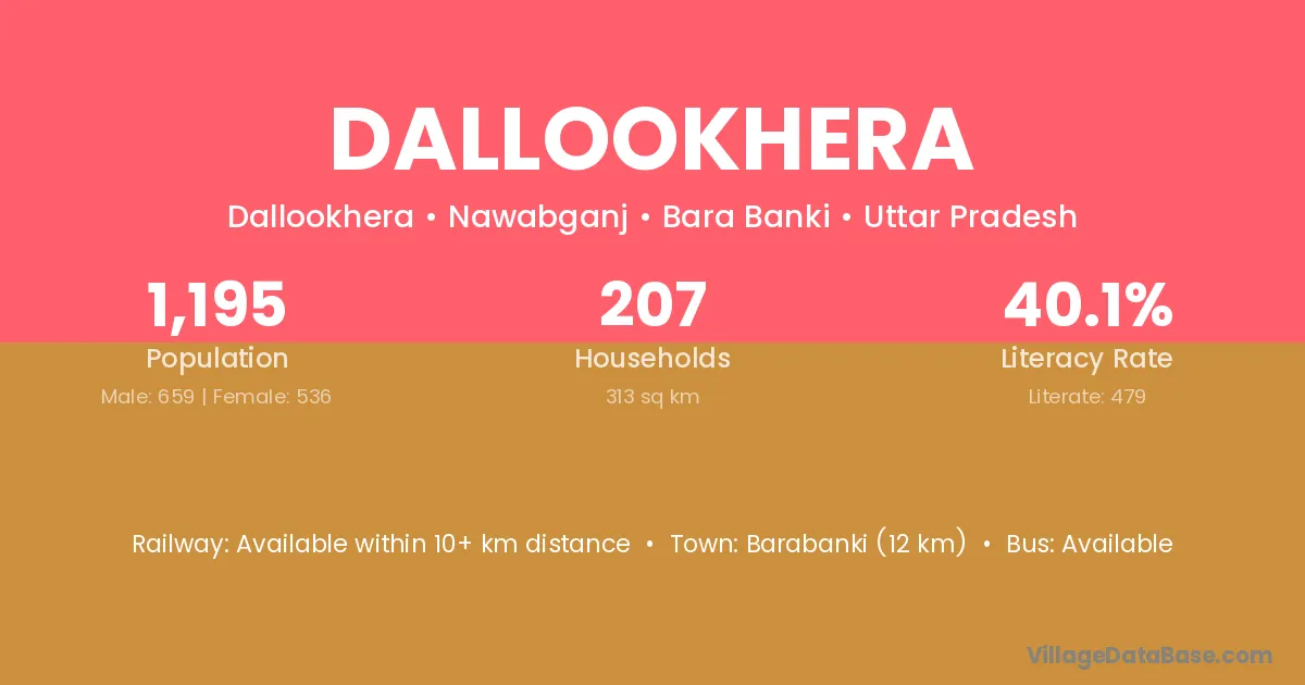 Barabanki (12 km) is the nearest town to Dallookhera village for major economic activities and is located approximately 12 km away.