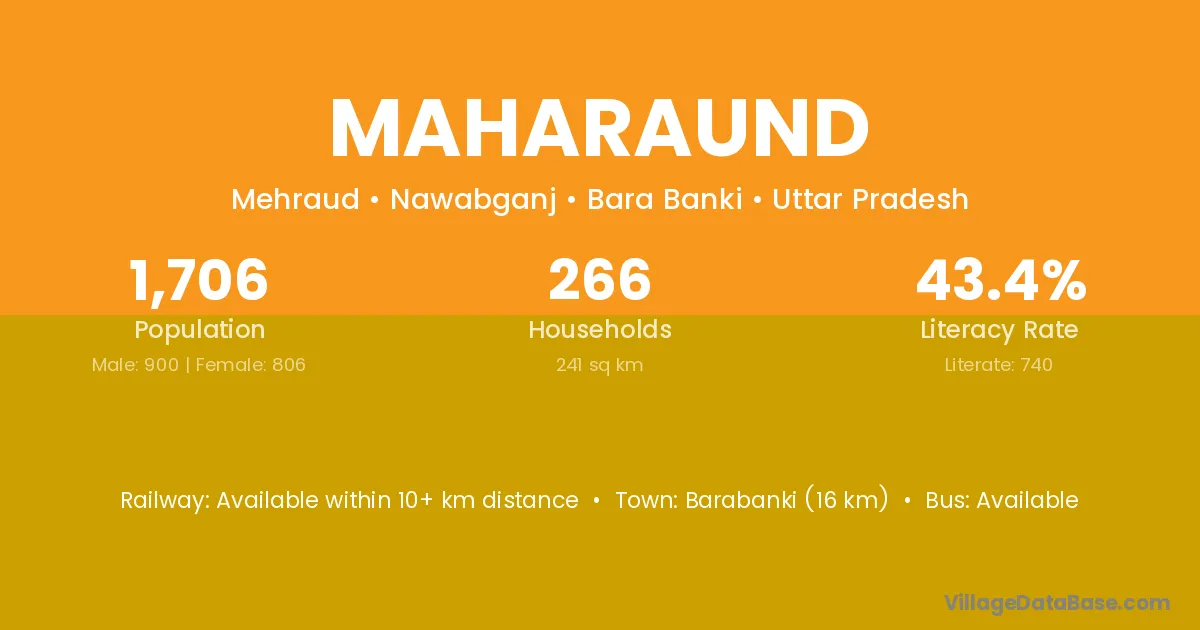 Barabanki (16 km) is the nearest town to Maharaund village for major economic activities and is located approximately 16 km away.