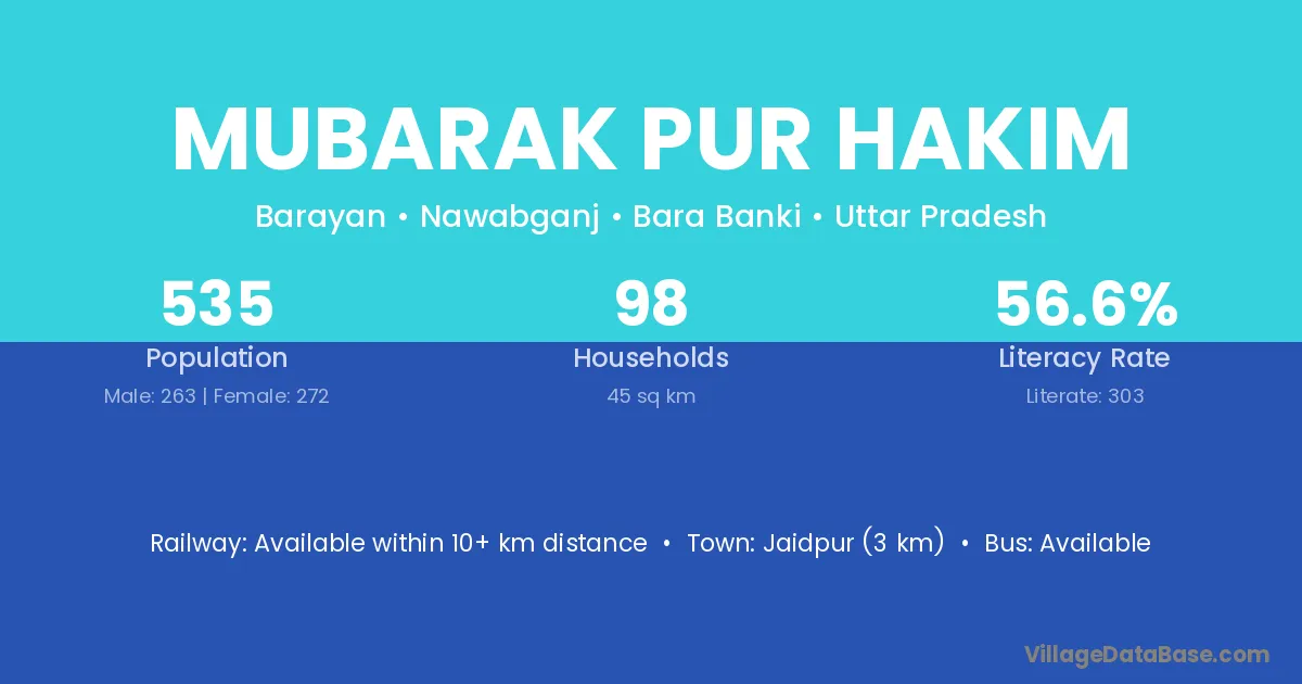 Jaidpur (3 km) is the nearest town to Mubarak Pur Hakim village for major economic activities and is located approximately 3 km away.
