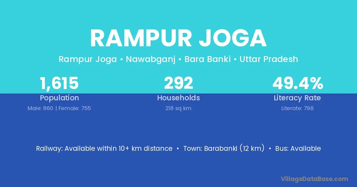Barabanki (12 km) is the nearest town to Rampur Joga village for major economic activities and is located approximately 12 km away.