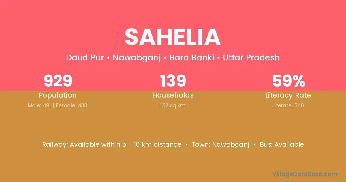 Sahelia village has a total population of 929 people, of which 491 are males and 438 are females.