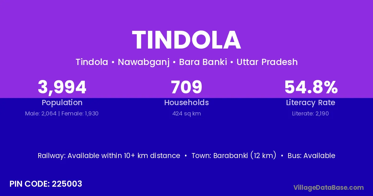 Barabanki (12 km) is the nearest town to Tindola village for major economic activities and is located approximately 12 km away.
