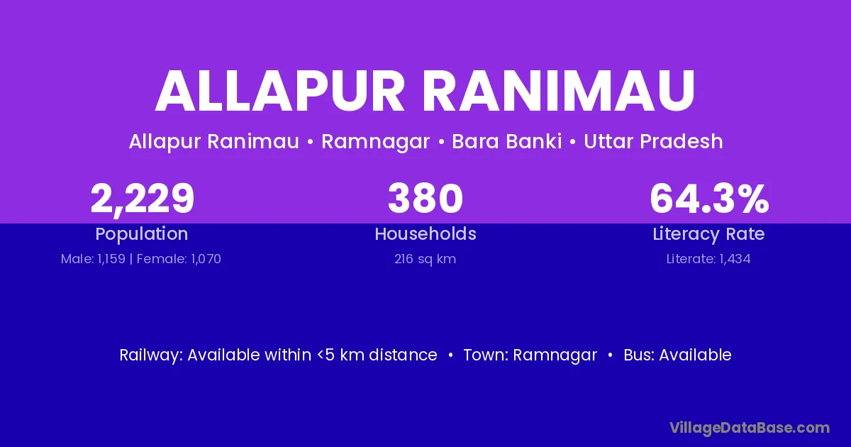 Allapur Ranimau village has a total population of 2,229 people, of which 1,159 are males and 1,070 are females.