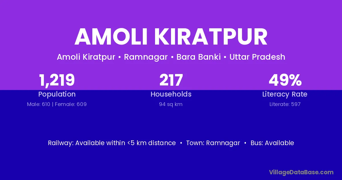 Amoli Kiratpur village has a total population of 1,219 people, of which 610 are males and 609 are females.