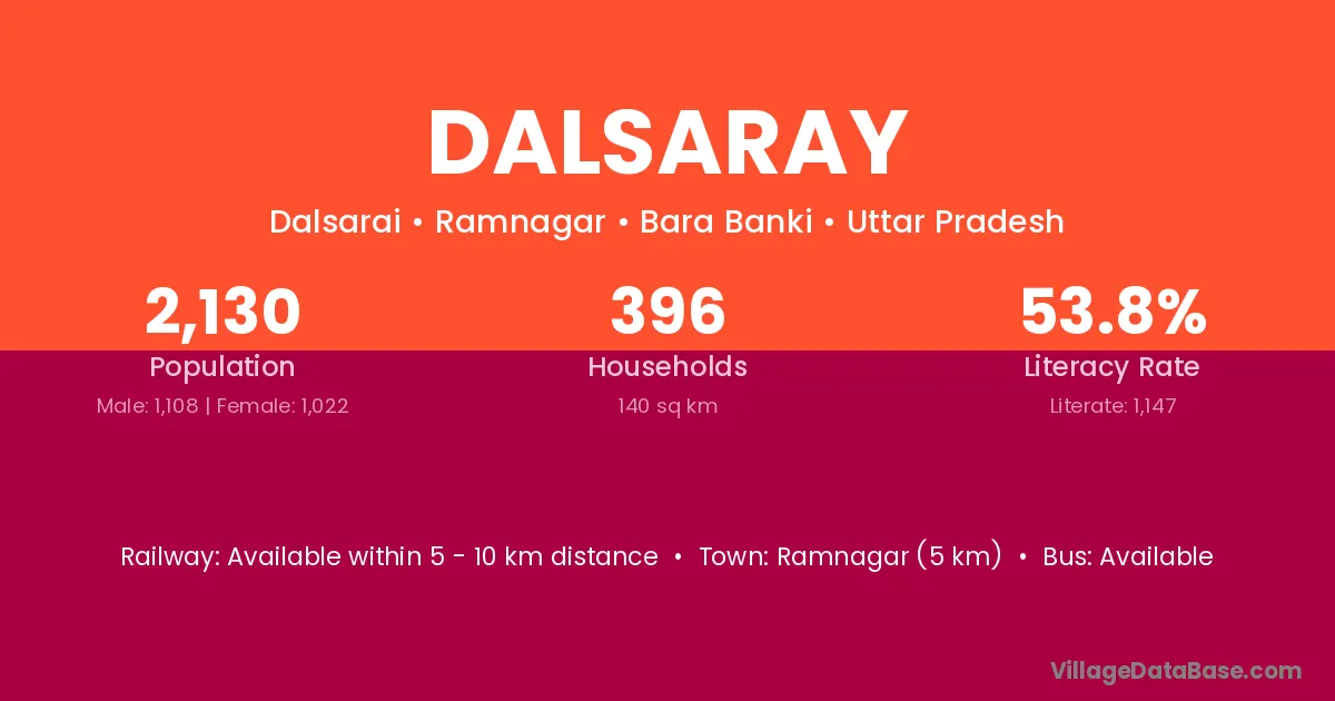 Dalsaray village has a total population of 2,130 people, of which 1,108 are males and 1,022 are females.
