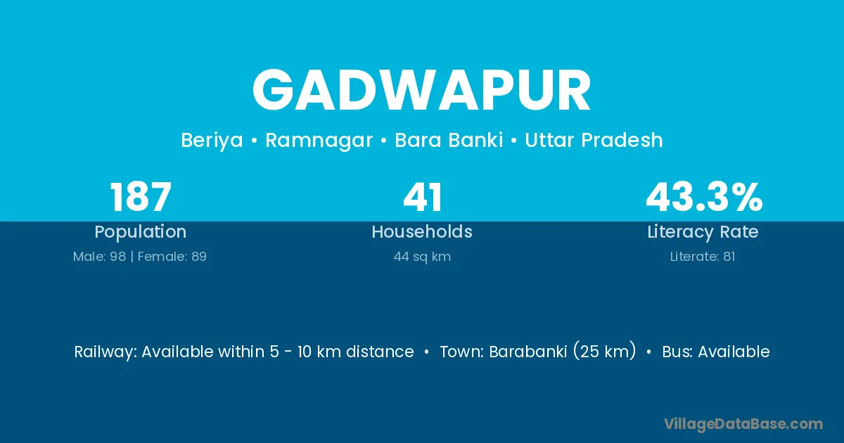 Barabanki (25 km) is the nearest town to Gadwapur village for major economic activities and is located approximately 25 km away.