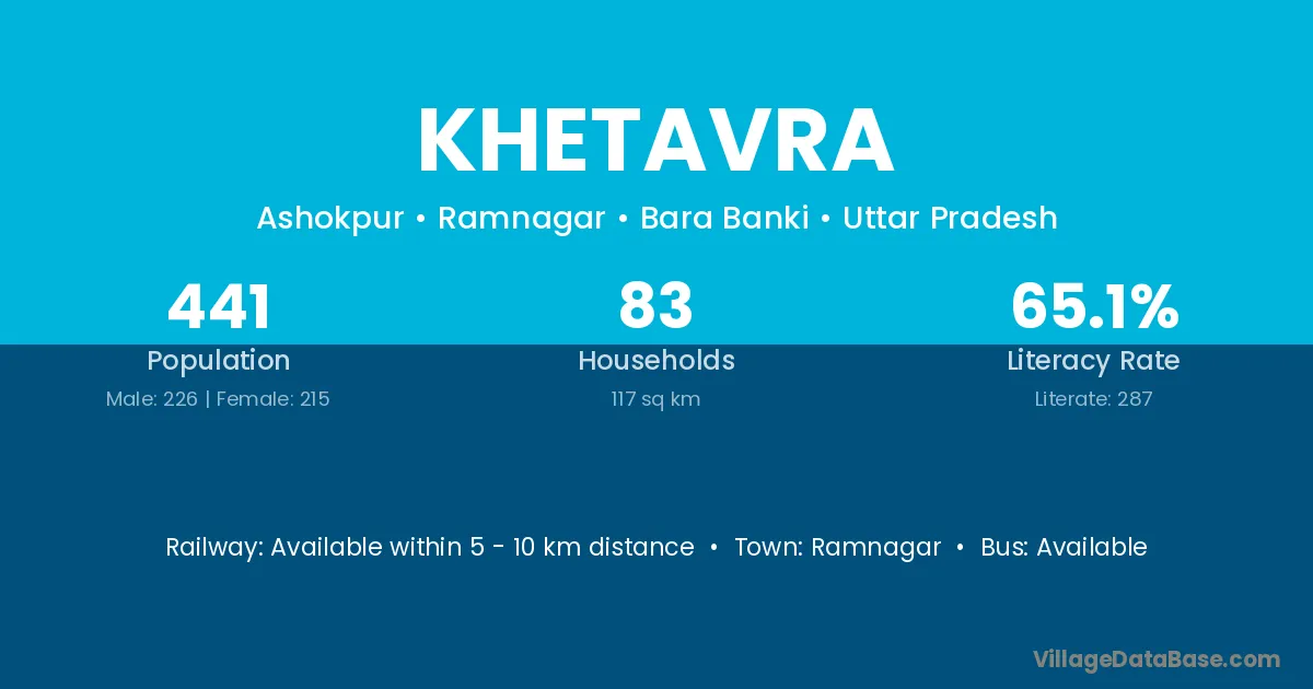 Khetavra village has a total population of 441 people, of which 226 are males and 215 are females.