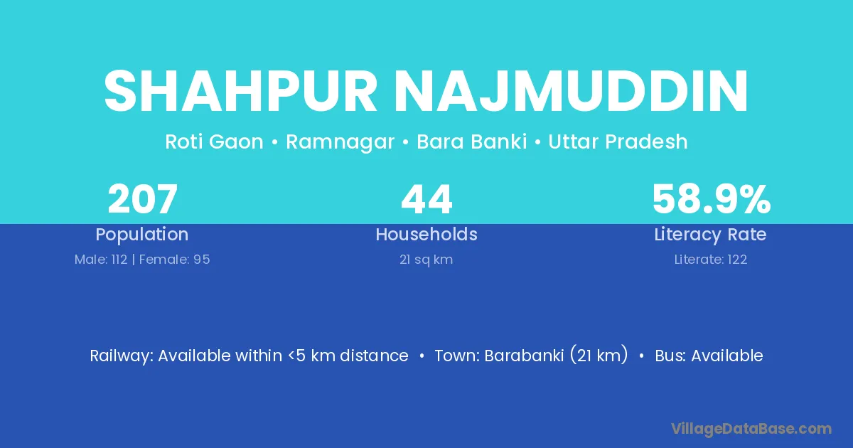 Barabanki (21 km) is the nearest town to Shahpur Najmuddin village for major economic activities and is located approximately 21 km away.