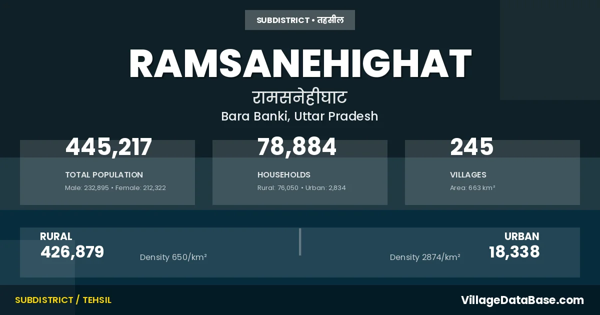 According to the 2011 census The total area of Ramsanehighat Tehsil is 663 km², with a population of 445217 people. The population density is 671 inhabitants per square kilometre, and there are approximately 78884 houses in the sub district.