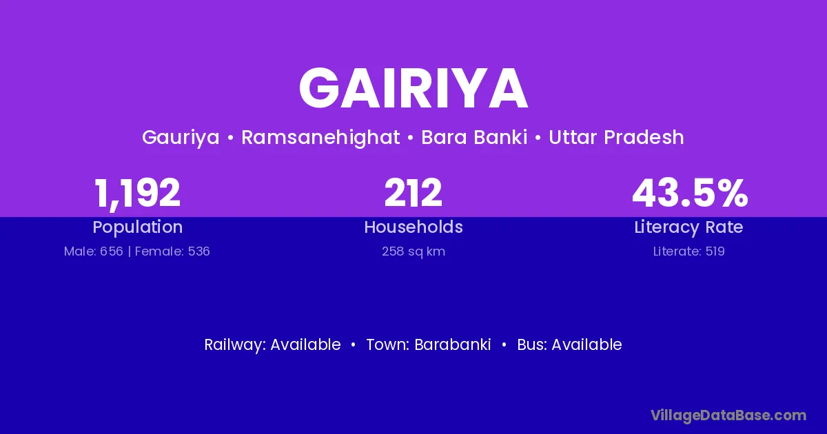 Gairiya village has a total population of 1,192 people, of which 656 are males and 536 are females.