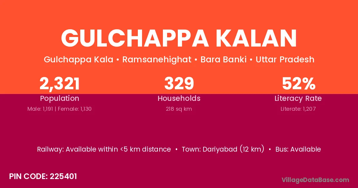 Gulchappa Kalan village has a total population of 2,321 people, of which 1,191 are males and 1,130 are females.